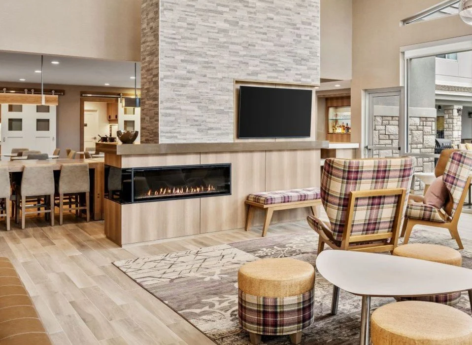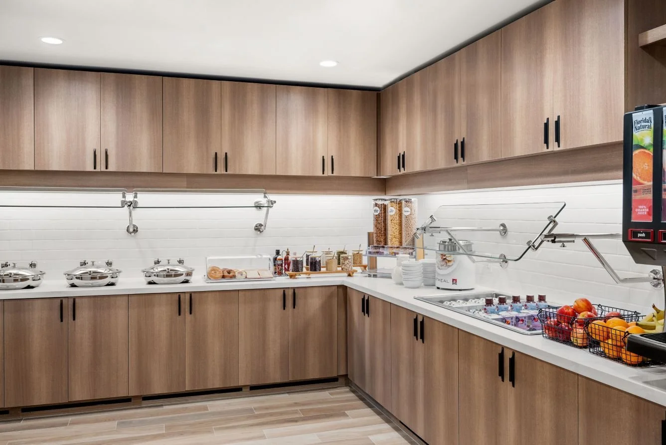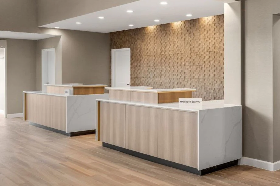 The new-build Residence Inn by Marriott in Homewood/Birmingham was completed in early 2025. While primarily based on the standard Residence Inn design, this project featured stained walnut guestroom kitchen cabinets, quartz countertops, bathroom vanities, built-in dressers with quartz tops, TV walls, dresser niches, and windowsills—all provided and installed by The Product Source.